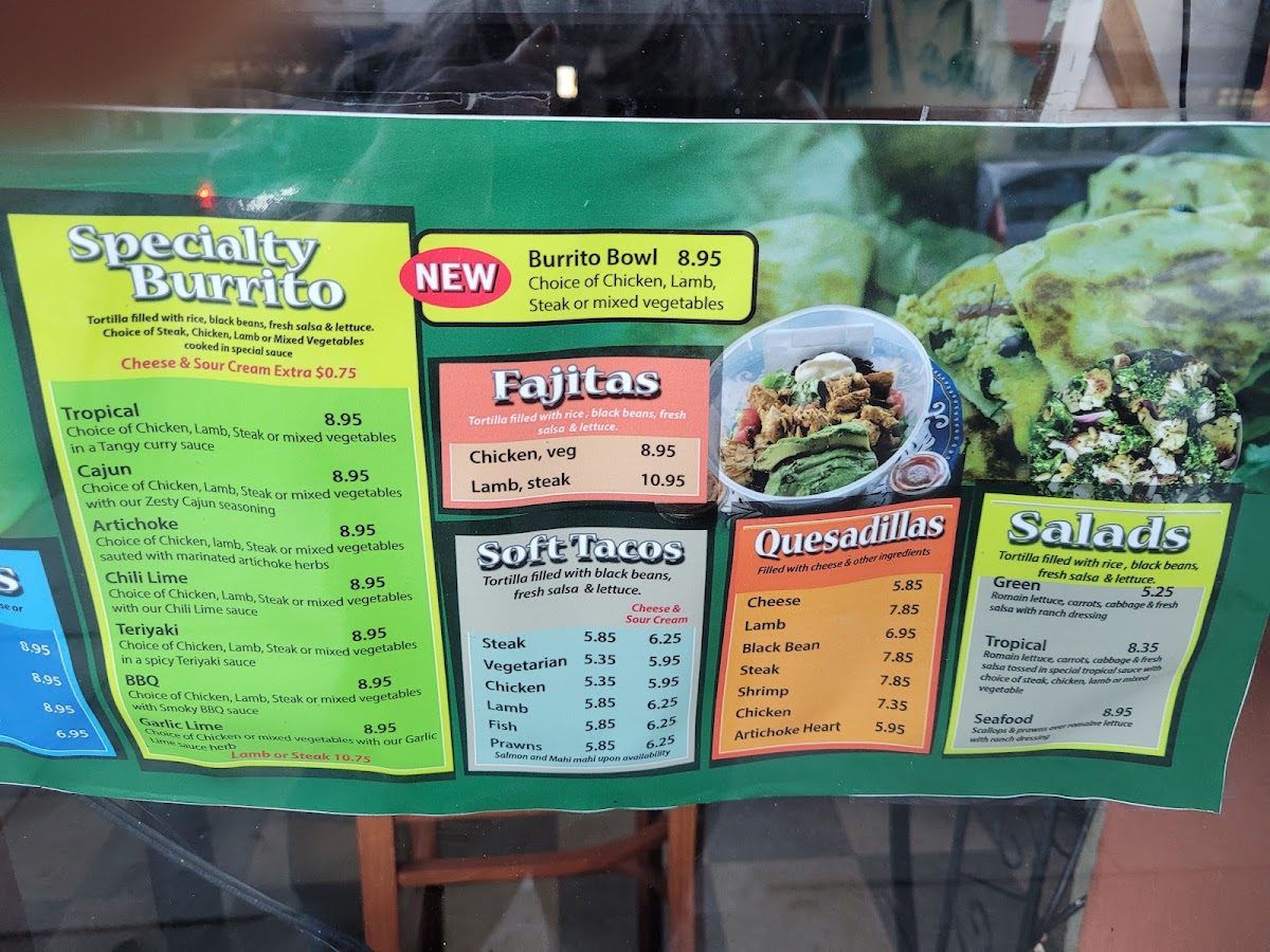 Romaine lettuce, carrots, cabbage, and fresh salsa tossed in a special tropical sauce with a choice of steak, chicken, lamb, or mixed vegetables.